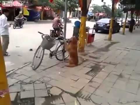 A bonyolult kerékpár zárak használata helyett ez a férfi egyszerűen csak letámasztotta a biciklijét és a kutyája vigyázó mancsaira bízta. Szó szerint, mert a kutya egy tapodtat se mozdult, két mellső mancsát a csomagtartón tartva vigyázta a kétkerekűt.