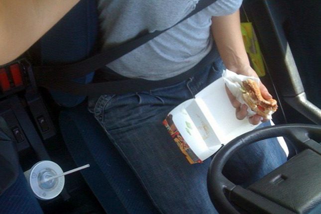 Egy 2012-es tanulmány szerint akik vezetés közben esznek, azoknak a reakcióideje 44%-kal romlik. Majdnem fele olyan gyorsan reagálnak egy éles helyzetre, mint nem zabáló társaik. Italfogyasztás közben a lassulás aránya – a sofőr reakcióidejének lassulása, nem a fékezés – 22%, és 18%-kal romlik a sávtartási képesség. Most tessék bekapcsolni a biztonsági öveket: ez szignifikánsan rosszabb, mint az Angliában engedélyezett véralkoholszint melletti lassulás (12,5%). Ha ehhez hozzávesszük, hogy a vezetés közbeni evésről sokaknak eszükbe sem jut, hogy veszélyes lehet, és egyáltalán nem vezetnek óvatosabban, miközben tömik az arcukba a burgert, megértjük, mi a probléma.