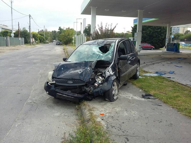 Eddig ismeretlen okokból egy személyautó nagy sebességgel belehajtott a töltőállomásba, letarolva a kutakat. Egyelőre nem tudni, mi történt, rosszul lett-e a sofőr, esetleg elaludt.